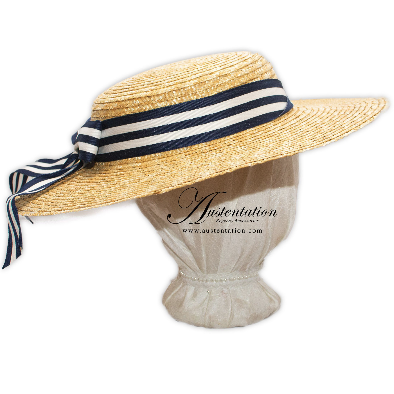 The straw boater hat became popular for both men and women during the last years of the 19th Century. Made famous in such films as Anne of Green Gables, it is a great topper for your more durable Edwardian outfits. You can see a similar hat in this portrait by John Singer Sargent (Mr. and Mrs. I. N. Phelps Stokes, 1897.) Hat measures: 14" diameter, 6x7" top of crown, 4" deep crown, 23 3/4" around inside crown.