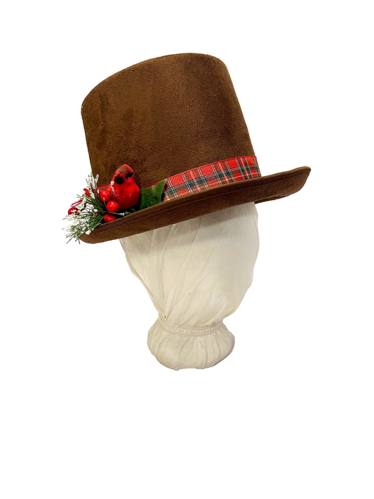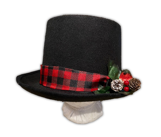 Men's Caroler Top Hat: Cardinal with Plaid Ribbon,