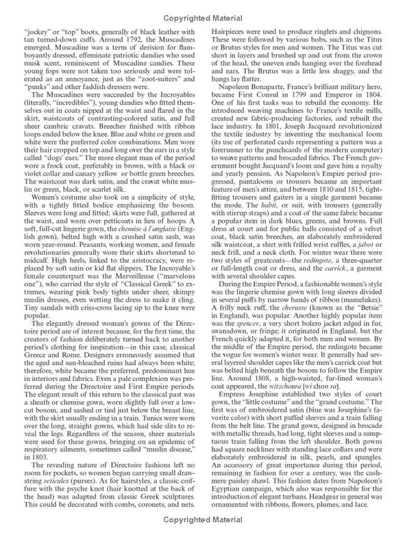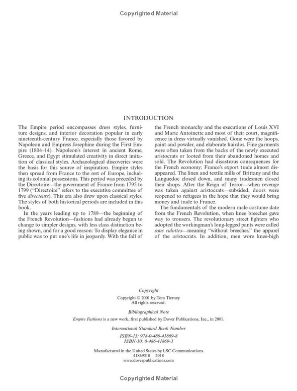 Forty-five plates of detailed, accurate illustrations include representative of claw-hammer frock, coats and vests for the well-dressed man, loose pantaloons and shorter skirts for the working classes, high-waisted promenade gowns for fashionable ladies, the coronation gown worn by Empress Josephine of France, and other examples of period dress. Footwear, walking sticks, reticules (purses), top hats, turbans, a "poke" bonnet, and dozens of other period accessories are included, along with hairdos for men and women.