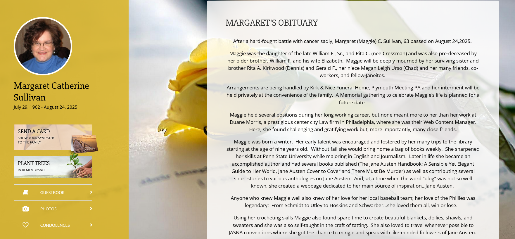 Those who knew Margaret C. Sullivan, (author of The Jane Austen Handbook, There Must Be Murder, Jane Austen, Cover to Cover, and other Austen related works) either in person or through her stories and books, already appreciate her creative sense of humor and delightful style. What you might not be aware of was her award winning needlework. Maggie was as prolific in her handiwork as she was in her writing. Her talents often overlapped as she combined her love of Jane Austen's works with her projects. This doily pattern is only one such example, and we are honored to be able to offer here as a free download, through the generous permission of Margaret's family.