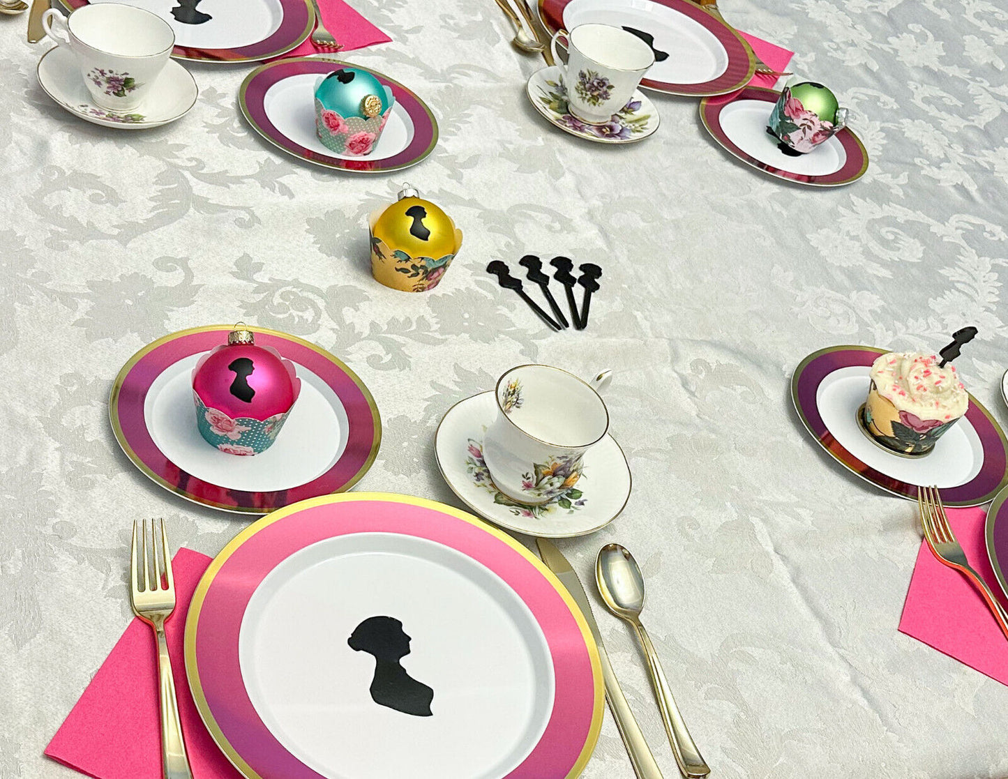 Heavy Duty Plastic Plates and flatware will pair beautifully with your own teacups or glasses. Cupcake wrappers can be used to adorn cupcakes or hold ornament favors (see photos.) Custom Jane Austen Silhouette party picks are printed from plant based resin.