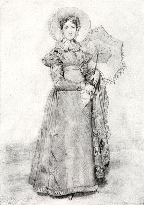 These bonnets are such fun to trim and would be great for any Dickens/Christmas activities you might have planned. The wide brim was popular during the late Regency (see the drawing by Ingres, 1823) and early Victorian era (think A Christmas Carol, published in 1843, which is the inspiration for many caroling ensembles and Dickens Fairs.)